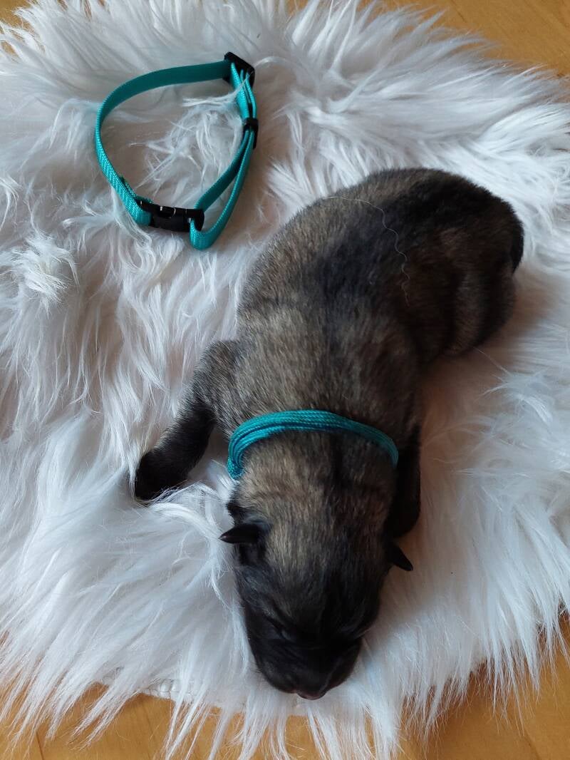 Um 02:43 Uhr kam mit 490 gramm der schwerste des Wurfes zur Welt. Unser grüner Bua dachte sich er muss seinen Bruder schon unterstützen und kann ihn nicht alleine lassen mit lauter Mädels.