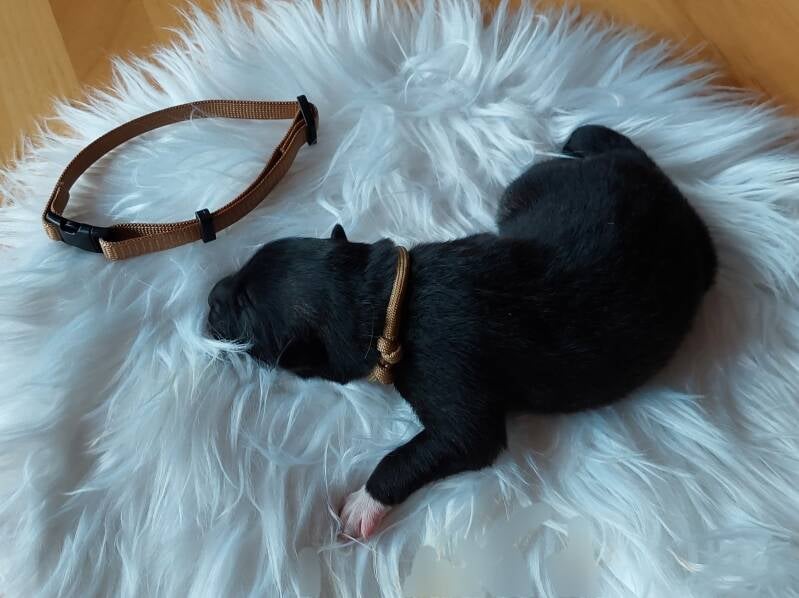 Unser erst geborener Welpe wollte verkehrt herum raus da brauchte Luna etwas Unterstützung.
